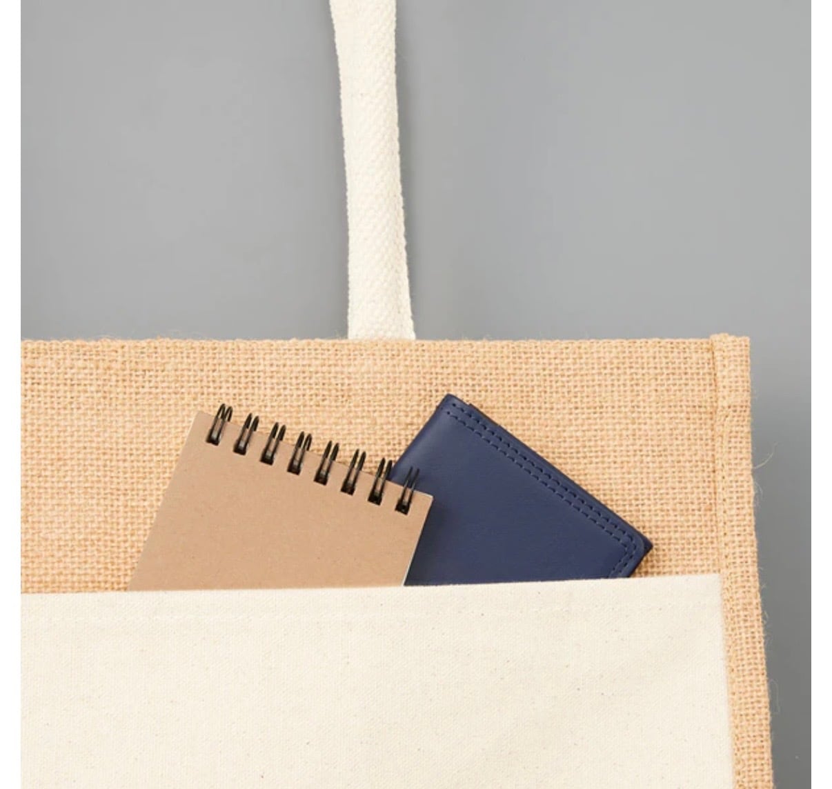 通気性・耐久性も抜群で麻素材のジュートバッグにキヤンバス素材のポケットを組み合わせたバッグです。